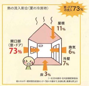 家の中に入ってくる熱は全体の73%が開口部(窓・ドア)から入ってくるとされており、室内の温度を上昇させるほか、室内熱中症の原因になります。