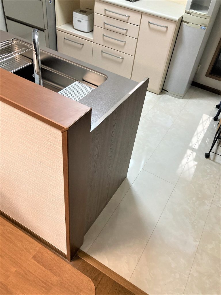 リビング部分のフローリングはそのままで良いとのことでしたので、リビング側とキッチン側を区切って張替えました。